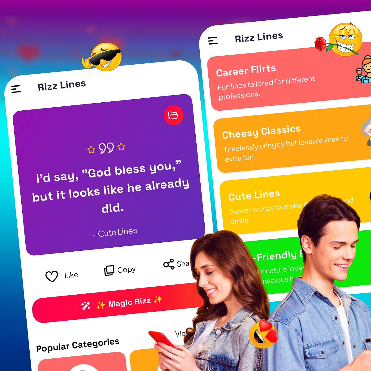Rizz Lines helps you break the ice with funny, romantic, and bold pickup lines, flirty compliments, and clever comebacks. Install free on Google Play and start flirting with confidence.